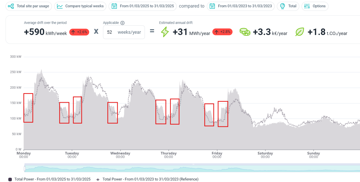 Note: This analysis is especially useful for non-temperature-sensitive uses (lighting, IT, etc.) or for thermosensitive uses when comparing periods with similar climatic conditions (no weather correction applied at this stage).